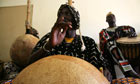 Later that day, walking through one of Bamako's markets, I get an unexpected demonstration of this non-griot music. There's a man dressed in mud-coloured clothes, patched and stitched with strange charms. He's carrying a kamalen n'goni, a six-string guitar made from calabash, broom handle and an old milk tin. He's a hunter, Sarah explains, and they have their own songs. The sound he makes is certainly not sweet: a roaring, driving hatchet job of a song, delivered at full blast inches from my face.