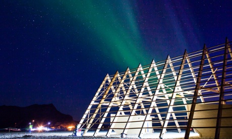 The northern lights glow in the sky over the SALT festival site during its opening weekend. Even the locals were surprised to see such a strong display so early in the year.Photograph: Kristian Sivertsen/SALT festivalA man watches a performance at SALT’s main stage, one of three wooden prisms built specifically for the site. The structures are based on traditional fish-drying racks from the region.Photograph: Will Coldwell/The GuardianArtist Yang Fudong lived on the island while producing a film installation for SALT, which is projected onto screens on wooden boxes situated along the beach. The northern lights can be seen, faintly, in the background.Photograph: Gunnar Holmstad/SALT festivalVisitors to SALT attempt to climb one the largest of the three wooden prisms on the site. Lots of families attended the opening weekend.Photograph: Will Coldwell/The GuardianLocal girls sell Torr Fisk (dried fish) on the beach. The snack is a local speciality and it takes up to three weeks to dry the fish, which is usually cod. The fish needs to be hammered with a mallet to soften it before eating.Photograph: Marte Antonsen/SALT festivalA view of Sandhornøya. The sparsely populated island in the Nordland region can be reached from the mainland by road – winding through the hills and fjords – or by boat.Photograph: SALT festivalFestivalgoers gather around the main stage. Performances during the opening weekend included musicians from the Arctic Philharmonic Orchestra and Norwegian electronic artist Biosphere.Photograph: Gunnar Holmstad/SALT festivalThe “amphisauna” at SALT is believed by some to be the world’s largest. Capable of seating around 120 people, the sauna has a bar at the back and fills up in the evening with those escaping the Arctic chill.Photograph: Kristian Sivertsen/SALT festivalYour room for the night: several “njallas”– movable tents that sit on skis – are available for visitors to sleep in. The tents can sleep four and have beds made out of branches and reindeer pelt.Photograph: Marte Antonsen/SALT festival