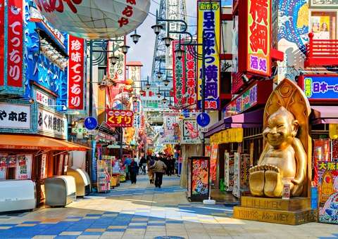 People really are food crazy in Osaka. They talk about it all the time – it’s a bit of an obsession. Street food is what it’s all about: different areas are dedicated to different dishes. Takoyaki are gooey doughballs with octopus inside and brown sauce and seaweed on top. You’ll find it in Triangle Park in the American Village (Shinsaibashi). It’s the equivalent of chips and curry sauce. Kushikatsu is another favourite street food – skewers of breaded and deep-fried meat, though there are veg and seafood options too. Look for it in the New World area, around the Tsutenkaku tower, which used to be somewhere tourists would avoid, though it’s quite gentrified these days.