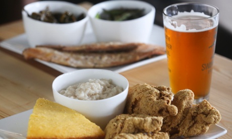 Sunshine plate: cornmeal crusted chicken fat fried chicken served with bacon fat cornbread and cheddar cheese sofkee at Fodder and Shine in Tampa. Photograph: Eve Edelheit